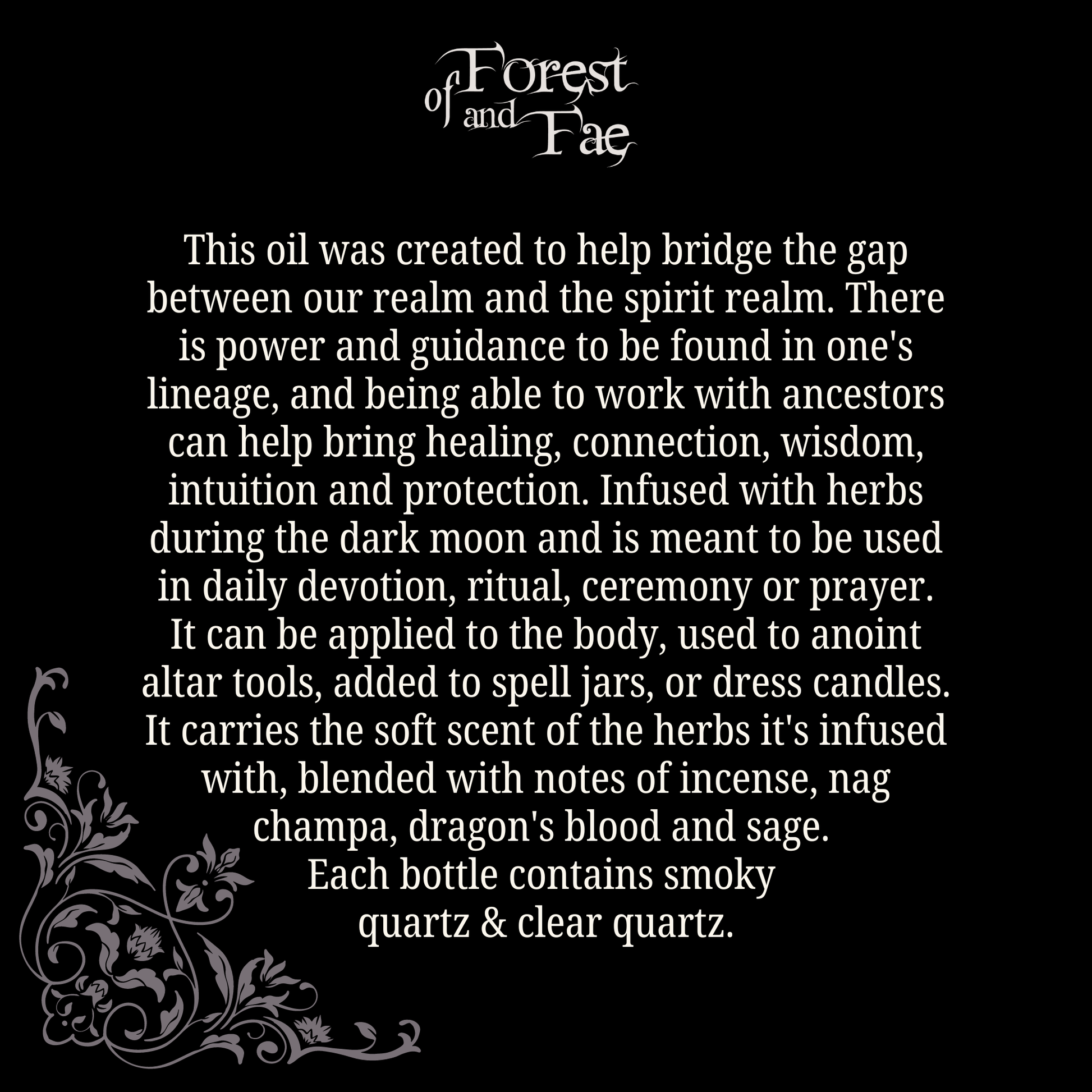 This oil was created to help bridge the gap between our realm and the spirit realm. There is power and guidance to be found in one's lineage, and being able to work with ancestors can help bring healing, connection, wisdom, intuition and protection. Infused with herbs during the dark moon, it's meant to be used in daily devotion, ritual, ceremony or prayer. It can be applied to the body, used to anoint altar tools, added to spell jars, or dress candles. It carries the soft scent of the herbs it's infused with, blended with notes of incense, nag champa, dragon's blood and sage. Each bottle contains smoky quartz & clear quartz.