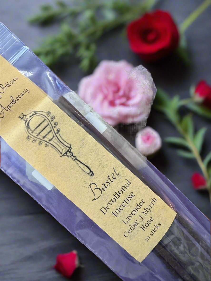 Invoke the goddess Bastet with this unique incense made from lavender, cedar, myrrh, and rose. Perfect for devotional rituals and relaxation.