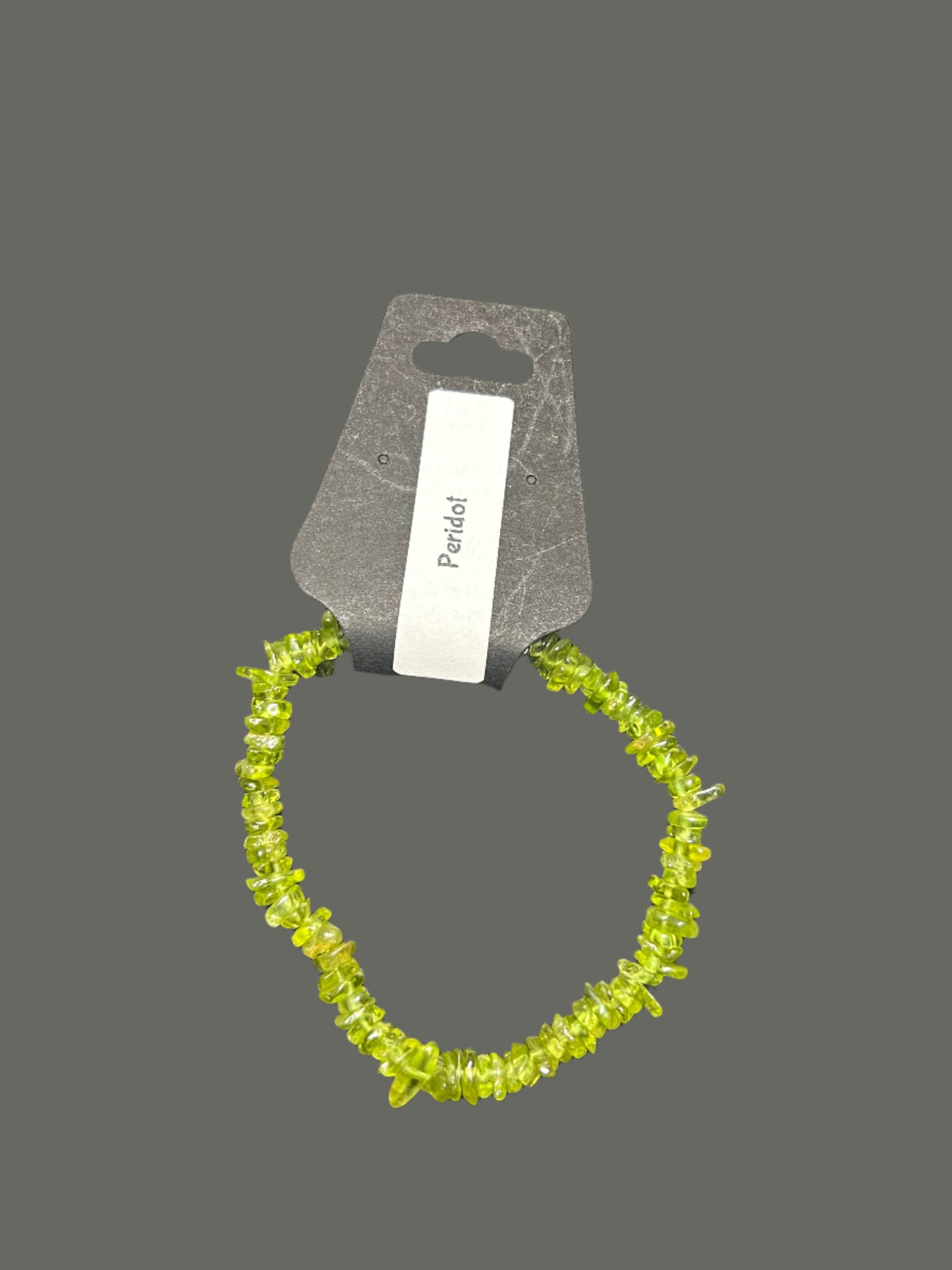 Peridot Chip Bracelet Strung on Elastic Fits 7-71/2 Inches Boost your style and energy with our Peridot Chip Bracelet! Made with elastic, it's easy and comfortable to wear on wrists sized 7-71/2 inches. Wear it alone or stack it with other bracelets for a pop of color and positive vibes. Perfect for any occasion or outfit, it's a must-have addition to your jewelry collection. Feel the empowering and calming effects of peridot on your mind, body, and soul. Don't forget to gift it to your loved ones for a meaningful and beautiful present!