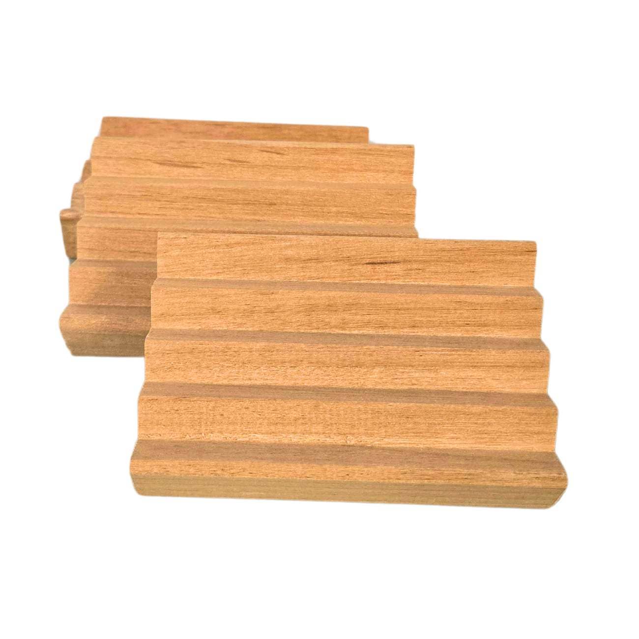 This draining soap dish does the job... elevates the soap and allows it to dry quickly. Our assortment includes a mix of different woods, including but not limited to poplar, birch, white pine, white oak, Spanish cedar, and North American cherry. Boardwalk Soap Dish Details: * Measures 2.75" x 3" and .75" thick. * Handmade in the USA * Extends the life of your handmade soaps Care instructions: Use your soap dishes in pairs to extend the life of the soap tray - use one dish for 2-3 weeks, and then switch it out with the second dish while allowing the first dish to completely dry out while you are using the second dish for 2-3 weeks. Doing this will prevent mold and mildew from developing and growing on your dish and significantly extend the life of the tray.