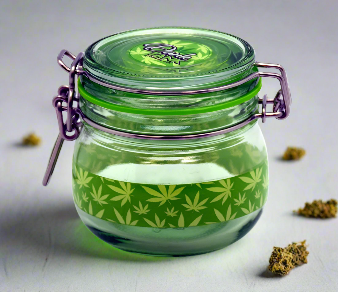 Elevate your storage game with the Medium Green Leaf Dank Tank. This Dank Tank features a vibrant silicone seal to ensure an airtight seal, and is composed of durable glass material. Measuring 2 3/4 inches wide and tall, it has a spacious 150 ml capacity.