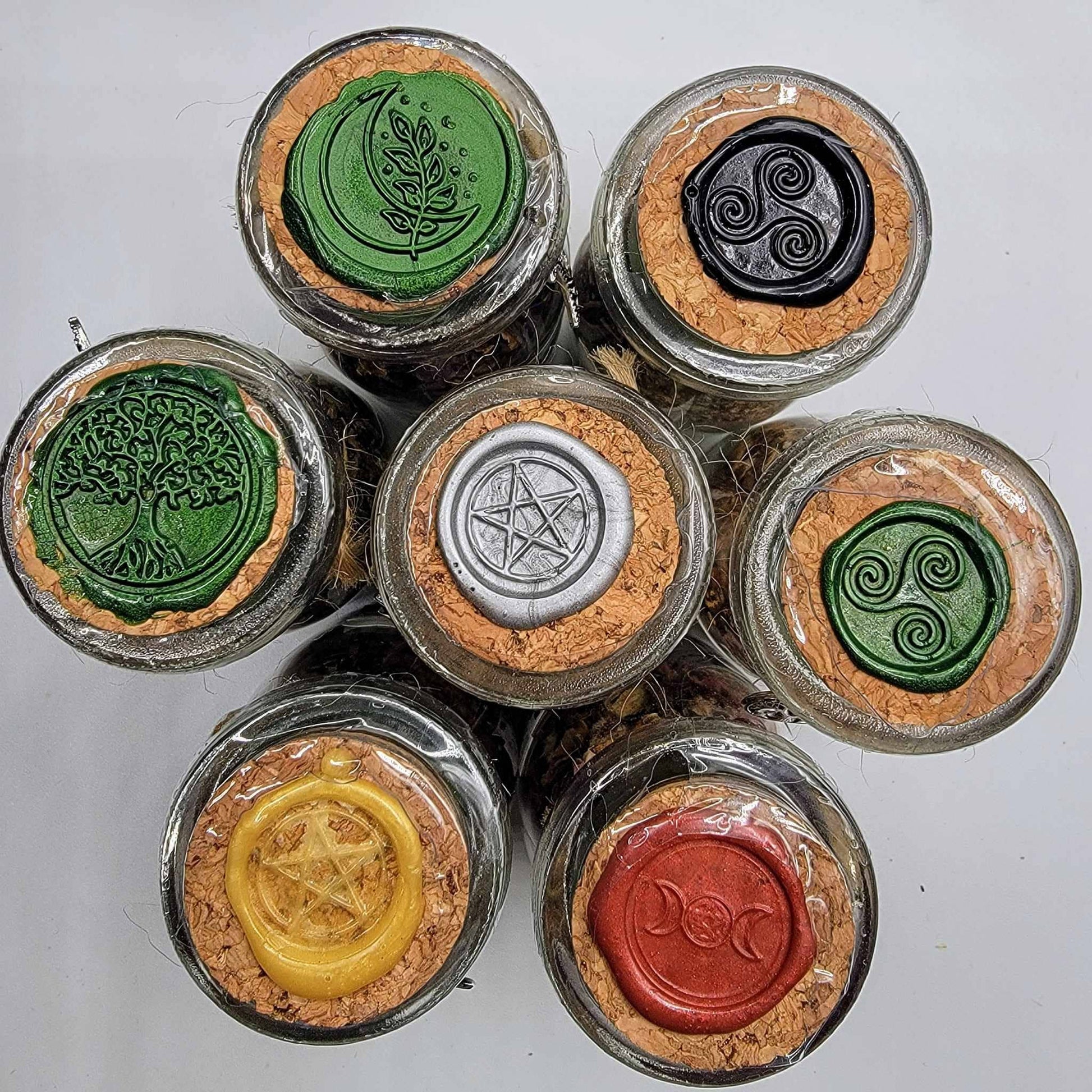 This is an aesthetically pleasing herb jar to adorn your altar. The jar is adorned with a charm and tied on with twine. A wax seal stamped with a design tops the all-natural cork lid. The label contains the name, botanical name, and various points of metaphysical information to help in spell work. Herbs are Organic certified. Herb Jar .50 oz Equisetum arvense