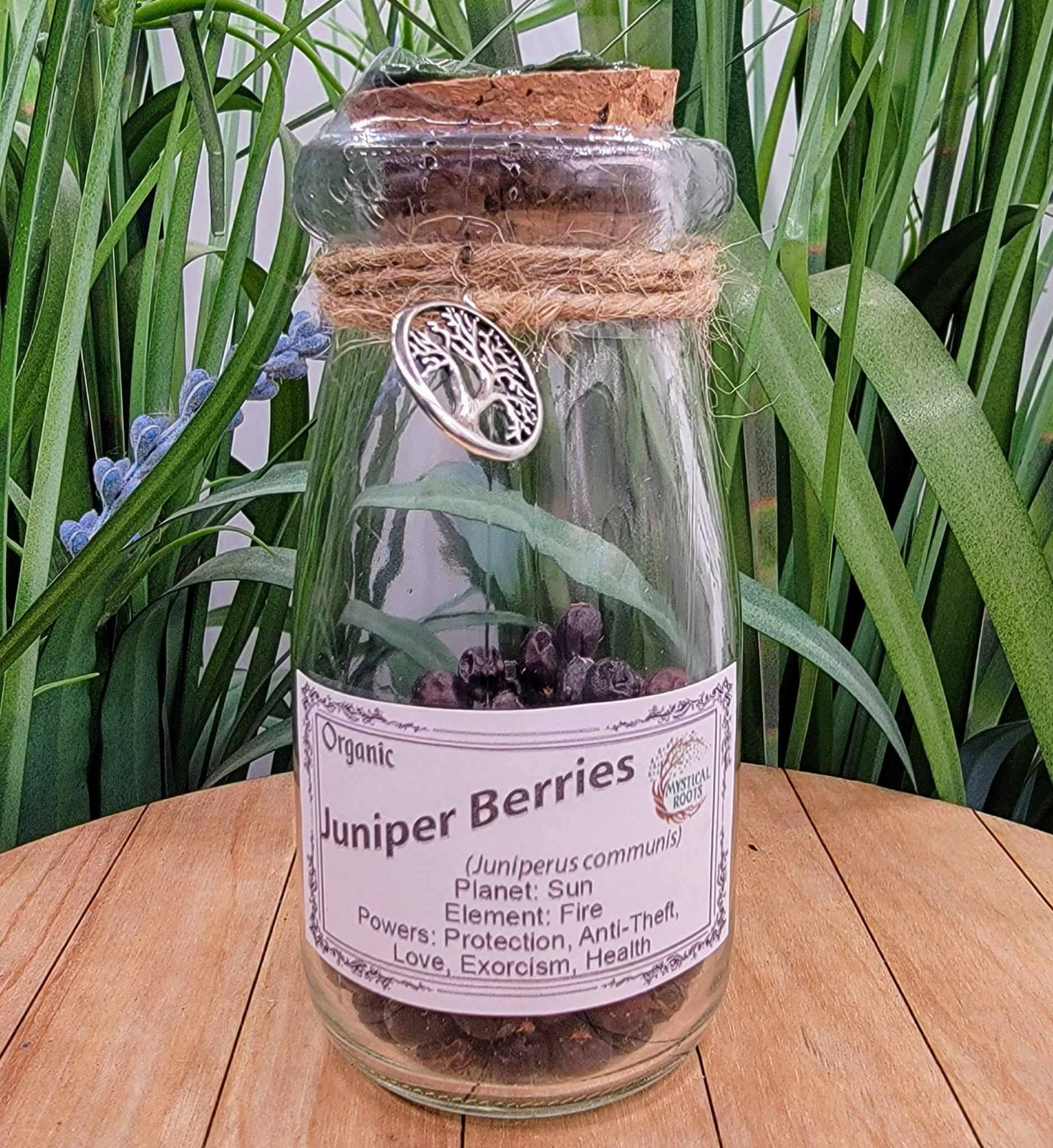 This aesthetically pleasing herb jar is designed to enhance your altar. Adorned with a beautiful Tree of Life charm and tied with twine, it is a functional and lovely decorative piece. A randomly stamped wax seal featuring a unique design adorns the all-natural cork lid. The label includes the herb's name, botanical name, and various points of metaphysical information to assist with magical work. Our herbs are sourced through organic cultivation and ethical wildcrafting methods, ensuring they are safe to eat and of the highest quality. Experience the difference between genuinely wholesome herbs! Herb Jar .50 oz Botanical Name: Juniperus communis General Warning: We recommend that you consult with a qualified healthcare practitioner before using herbal products, mainly if you are pregnant, nursing, or on any medications.