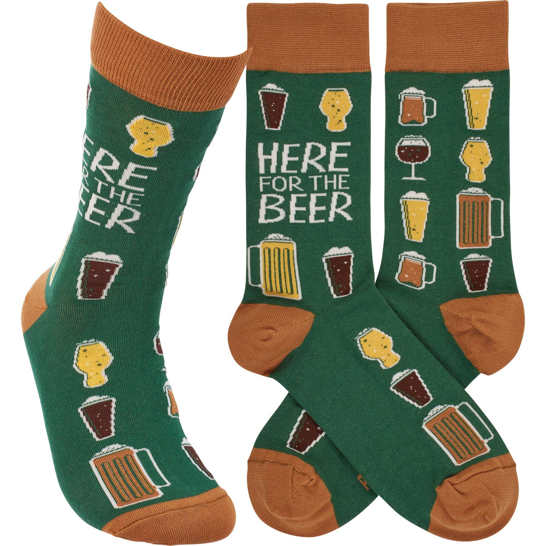 A pair of colorful woven socks from our Grilling & Chilling Collection displaying coordinating beer glass themed designs on each with humorous "Here For The Beer" sentiment. Perfect for anyone who knows their priorities, these socks bring a lighthearted vibe to your everyday wardrobe. Whether you're heading to a backyard barbecue, tailgate party, or just want to add some fun to your sock drawer, these conversation starters deliver comfort and personality in one package. The durable blend of cotton, nylon, and spandex keeps your feet cozy and supported all day long, while the vibrant colors and playful graphics make them a must-have for beer enthusiasts and humor lovers alike. One size fits most, making them an easy gift for the grill master or party-goer in your life.