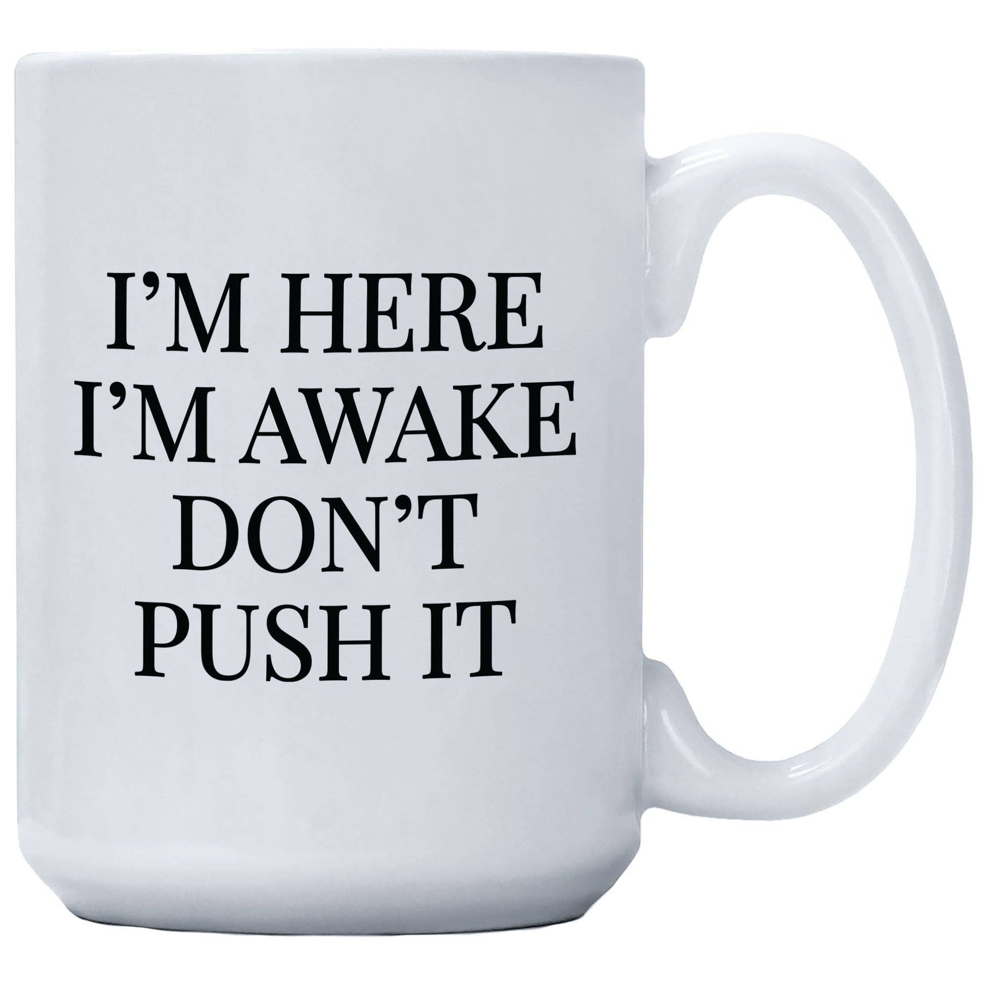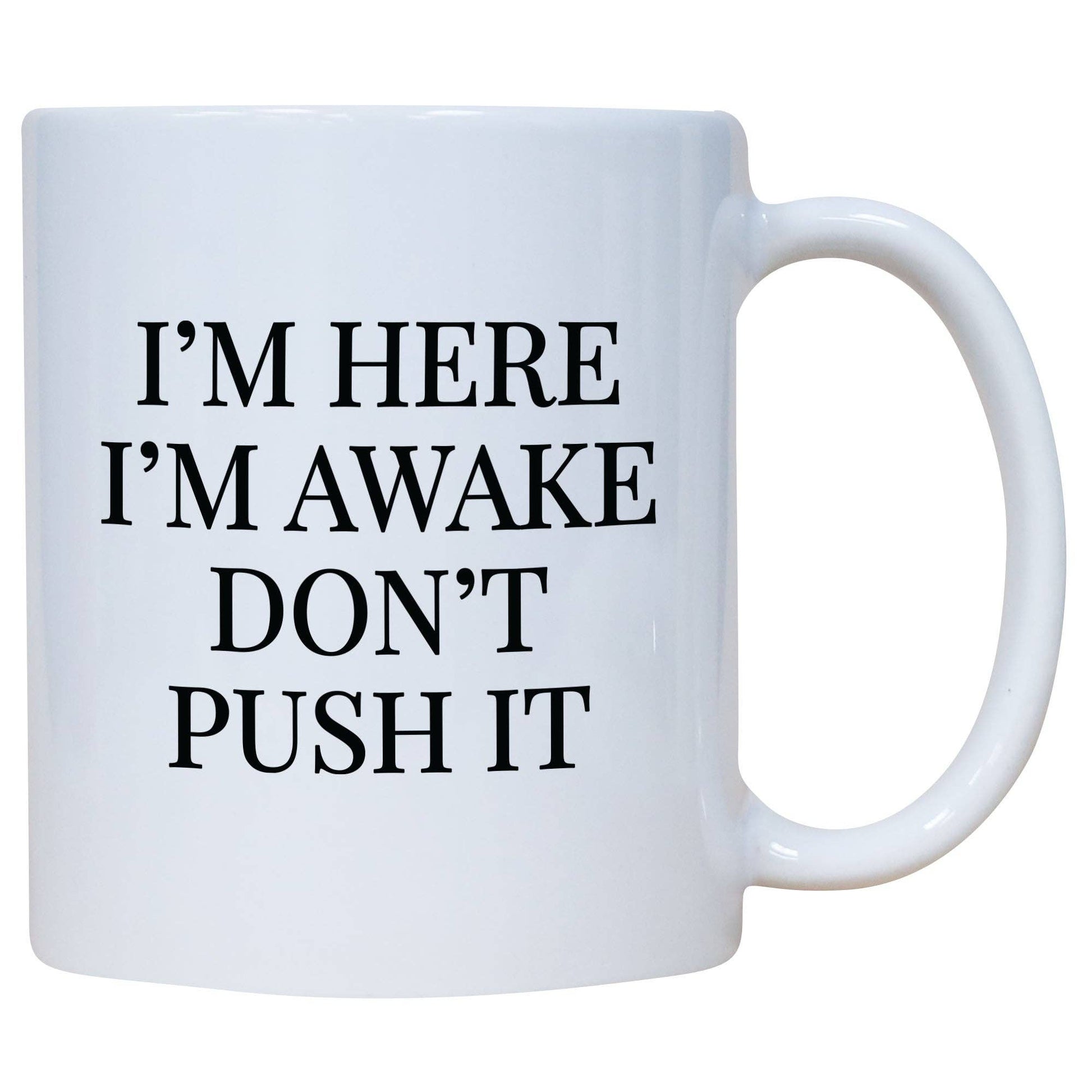 I'm Here I'm Awake Don't Push It Details: * Printed on both Sides of Mug. * Designed and Printed in the USA * Printed with Quality Inks that are Baked into the Ceramic and will not Peel or Fade. * Care: * Dishwasher and Microwave Safe! * Wash Before Use and Avoid Abrasive Cloths When Cleaning * Use Caution When Removing from Microwave