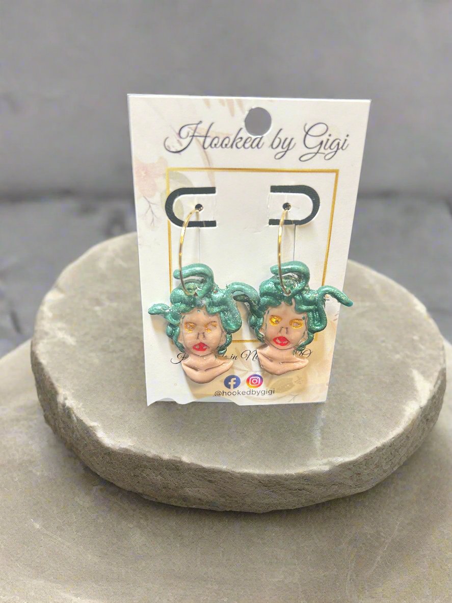 Handmade Clay Medusa Earrings on Gold Tone Hoops