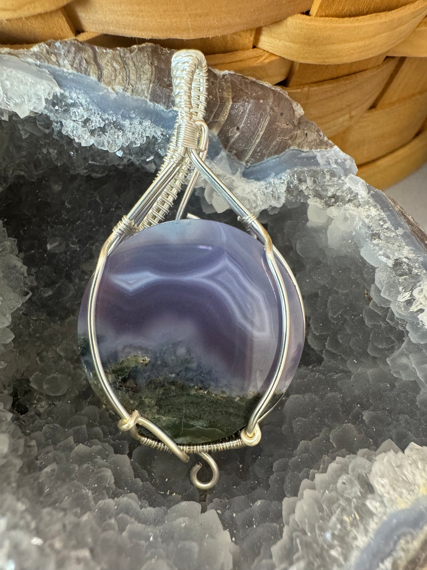 This hand wrapped pendant showcases the unique beauty of Purple Moss Agate. Each piece is carefully crafted to highlight the natural patterns and colors of this stunning gemstone. Elevate any outfit with this one-of-a-kind pendant that exudes elegance and charm.