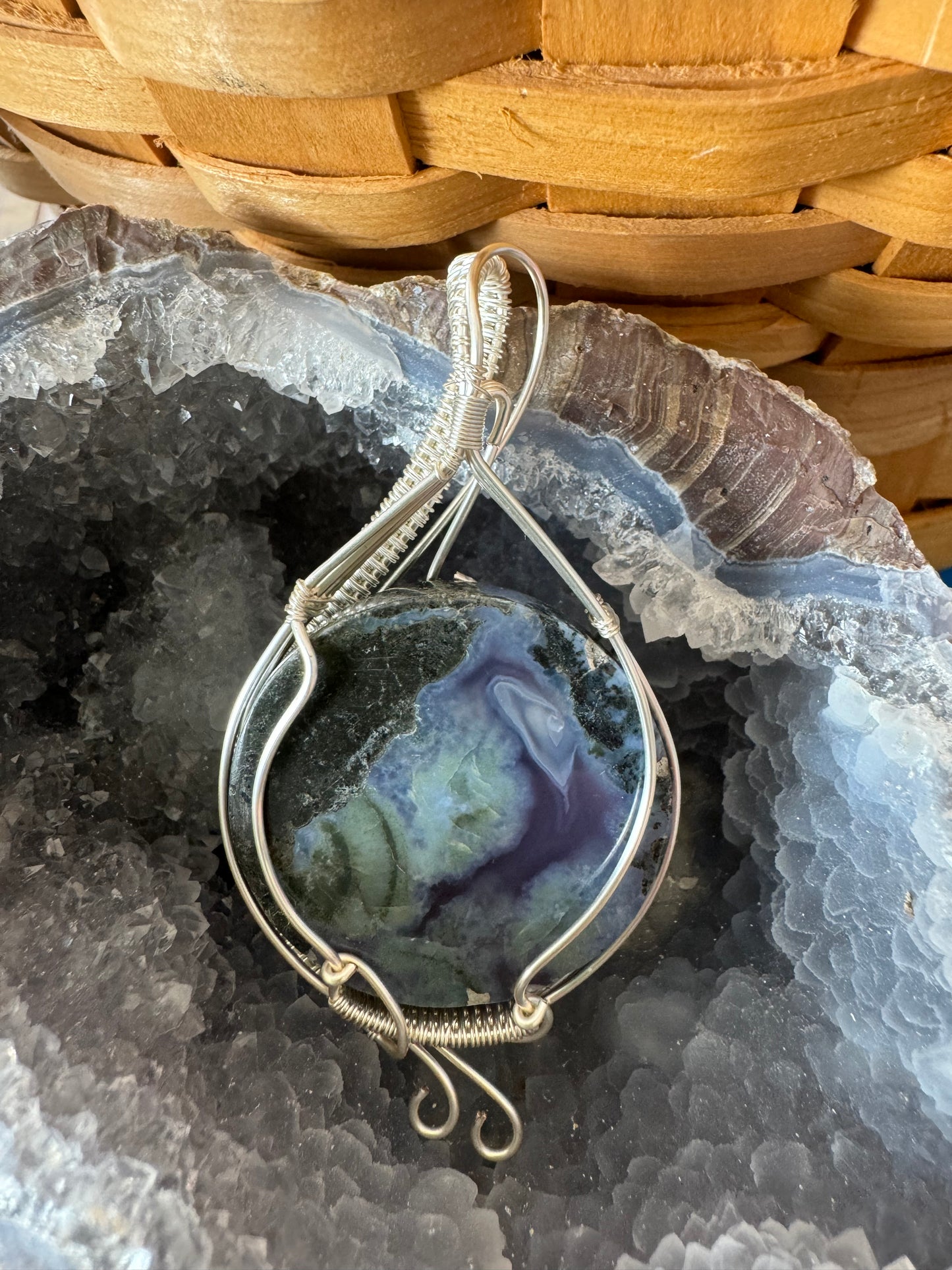 Elevate your style with our Hand Wrapped Purple Moss Agate Pendant. Each unique pendant is carefully crafted to showcase the mesmerizing purple hues of the moss agate. Perfect for any occasion, this pendant is sure to make a statement and add a touch of nature's beauty to your look.
