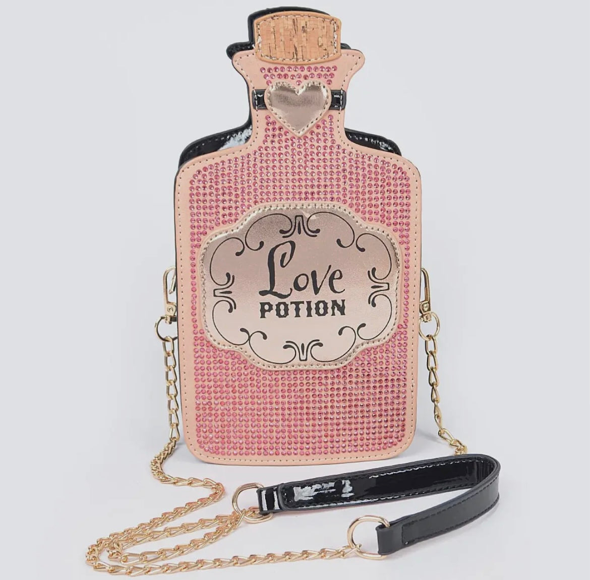Indulge your senses with the Love Potion Novelty Bag! Crafted from a stunning blend of Polyurethane and Mixed Metals, this bag boasts a perfect size of 5.25" W x 10" H x 3" D, complete with dazzling Rhinestones. Elevate your look with this must-have accessory today!