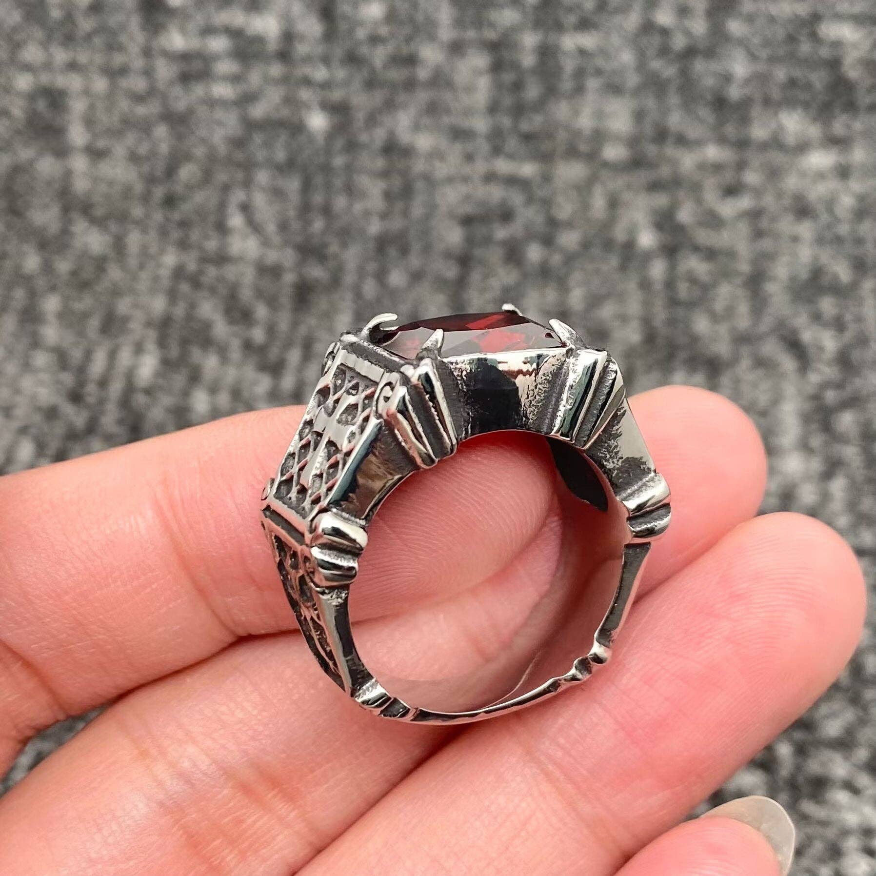 Red Gemstone Stainless Steel Cross Ring