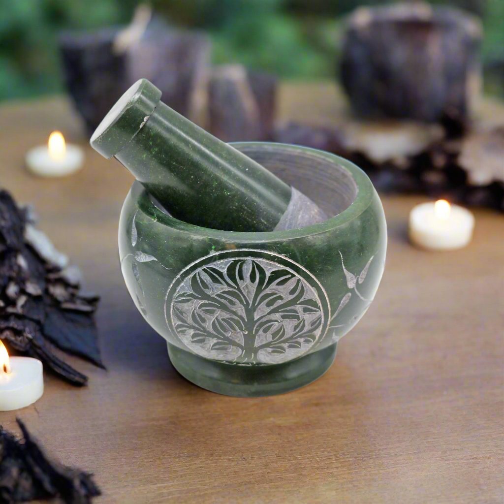 3" x 3.5" Soapstone Mortar & Pestle - Green Tree of Life