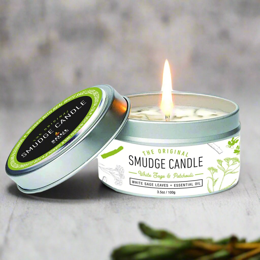 (Soul Sticks) 3.5 oz. White Sage & Patchouli Smudge Candle - Made with 100% Eco-Soy Wax, Lead Free Wicks, Organic Herbs & Crystals Clears away negative energies. Tired of smoky sage in your home or office? People all over the world burn sage as a way of clearing energy and spirits from a space - this practice is called smudging. While the traditional method is to burn dried sage leaves - sometimes it's just not feasible. People with allergies, sensitivity to the smoke or shared public environments like apartments and offices make burning sage hard to do. Our candle version "Sacred Smudge" is intended to replace negativity with Love, Light, and Positive Energy.
