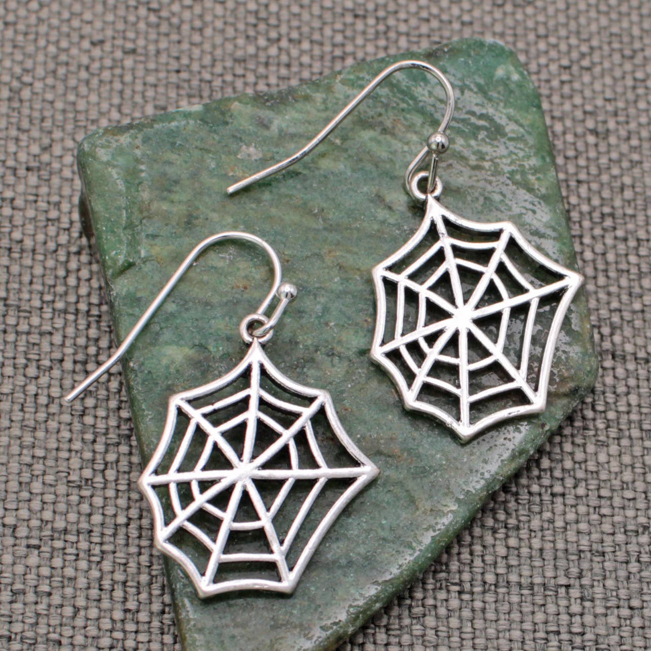 Spin some style magic with these silver spider web earrings. Delicately detailed with an intricate web design, they add a perfect touch of spooky chic to any outfit. These spider web earrings are great for Halloween, gothic vibes, or anyone who loves a little web of whimsy in their look. Tiny spider web charm earrings * Halloween inspired earrings * Measures (approx.): 1 1/4 x 3/4" * Materials: Silver Tone Metal