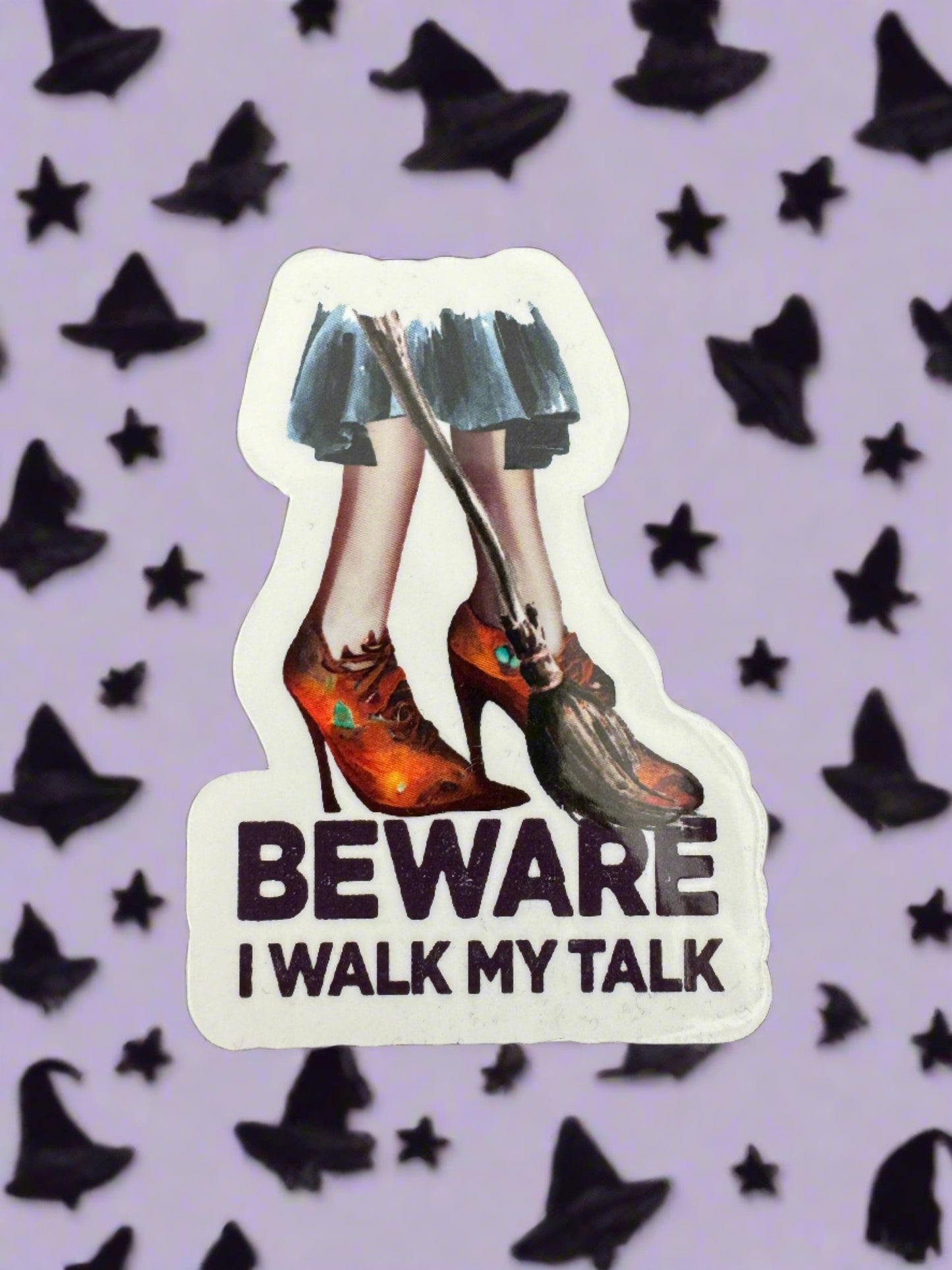 Unleash your playful side with our Beware I Walk My Talk Sticker! This cute witch sticker adds a touch of whimsy to any surface. Show the world you walk your talk with this charming and unique sticker. (Spells not included.)