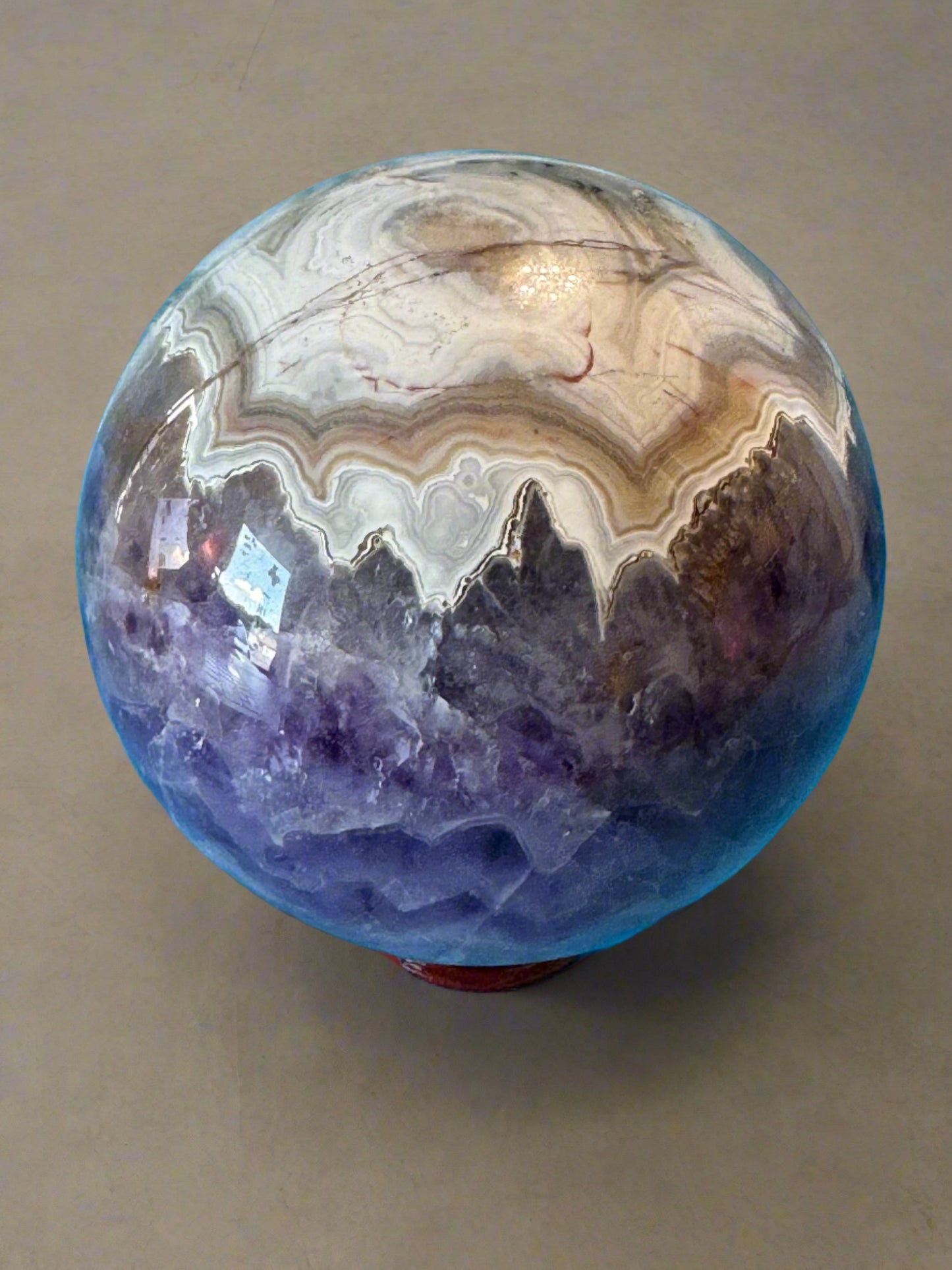 Elevate your space with this Amethyst and Crazy Mexican Lace Agate sphere! A perfect accent for any room, this unique stone sphere comes with a complimentary stand. Each sphere is 76.7mm, making it a substantial addition to any collection. Stand included. Add some natural flair to your decor!