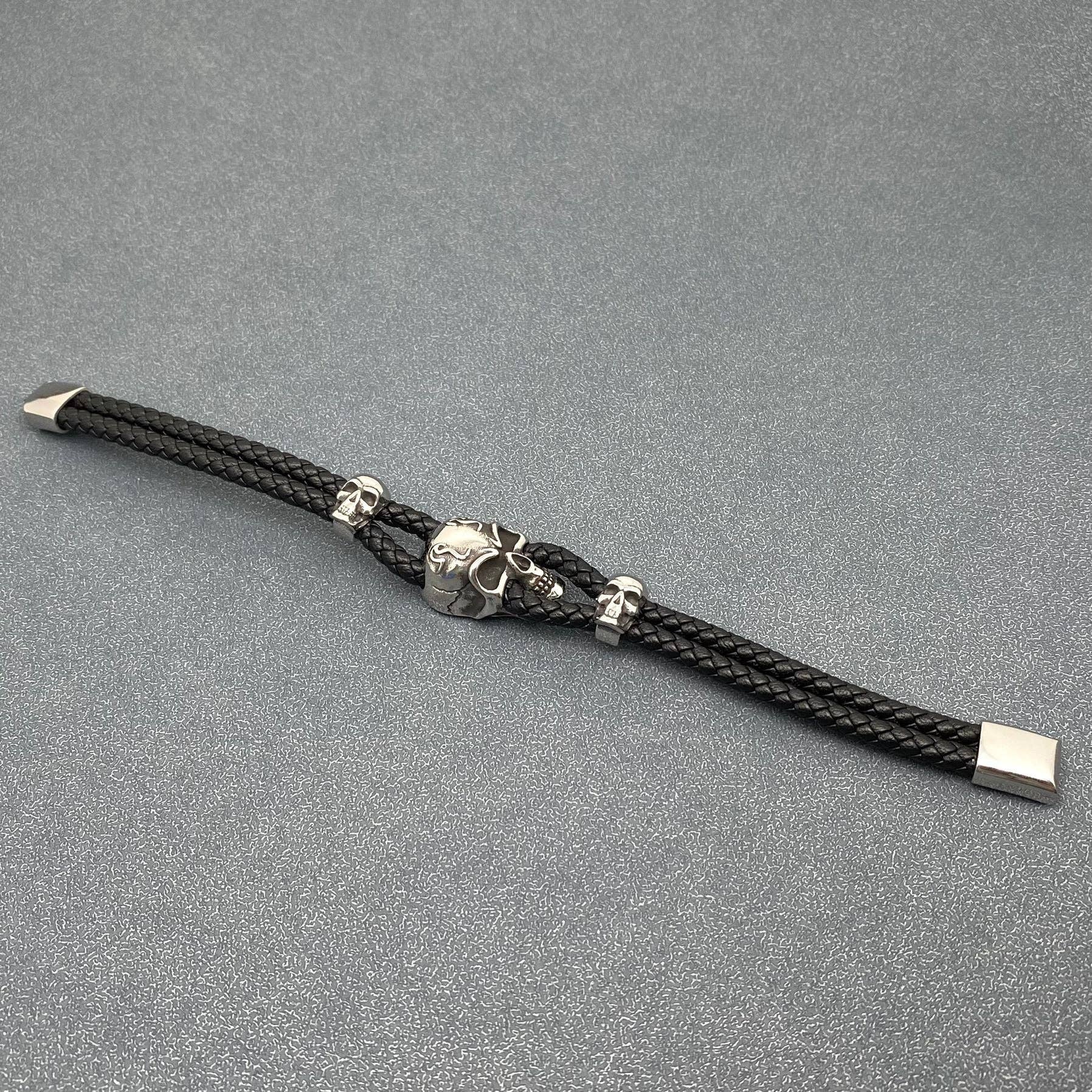 Triple Stainless Steel Skull Men's Leather Bracelet