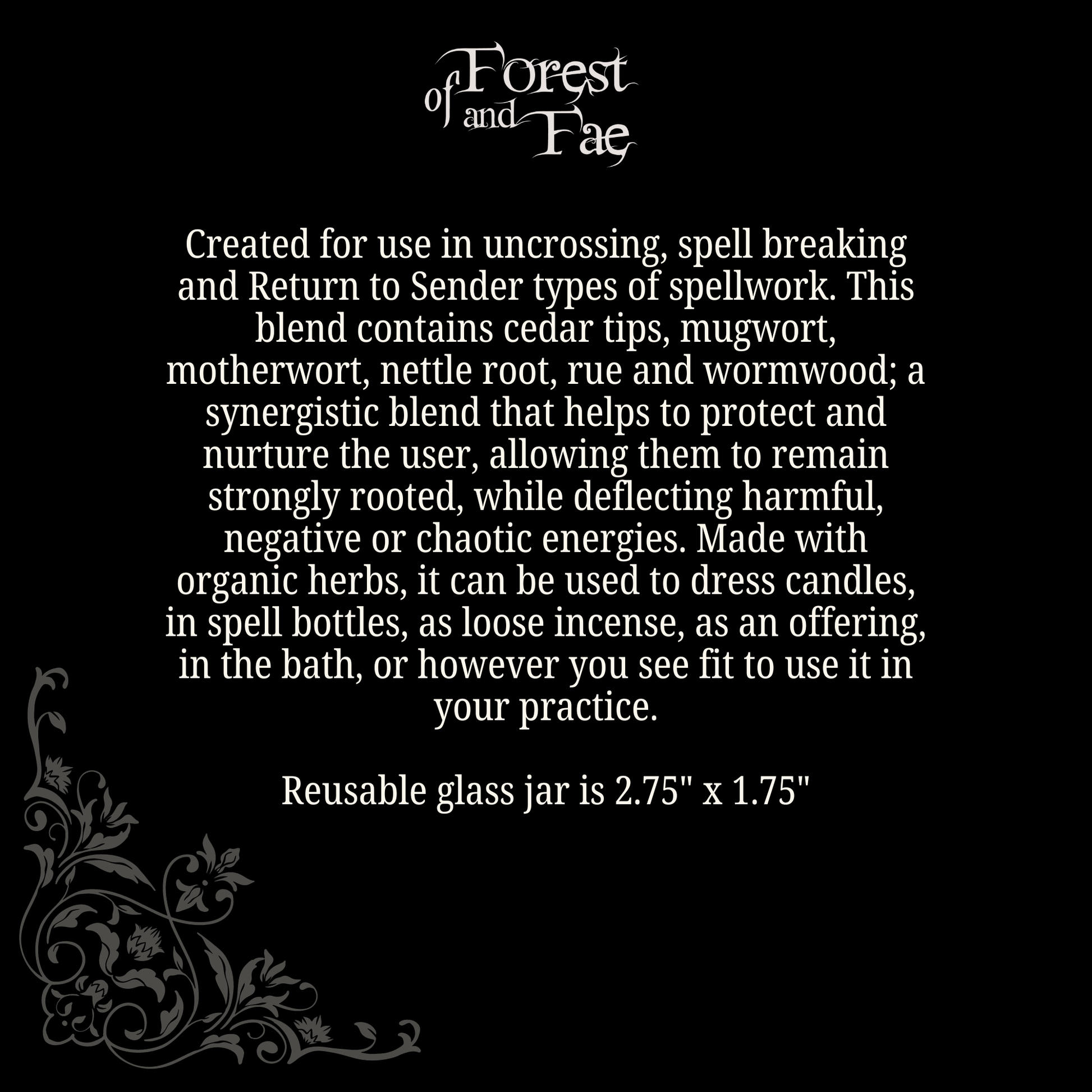 Created for use in uncrossing, spell breaking and Return to Sender types of spellwork. This blend contains cedar tips, mugwort, motherwort, nettle root, rue and wormwood; a synergistic blend that helps to protect and nurture the user, allowing them to remain strongly rooted, while deflecting harmful, negative or chaotic energies. Made with organic herbs, it can be used to dress candles, in spell bottles, as loose incense, as an offering, in the bath, etc.