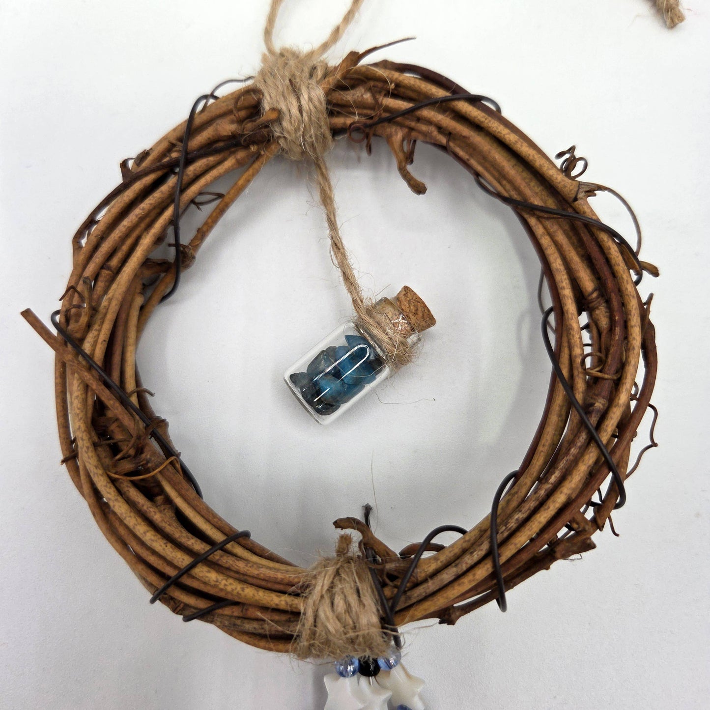The beads are made of Labradorite, Howlite, Dyed Agate, shell, and plastic. The gemstones in the middle of the wreath are made of Blue Apatite.