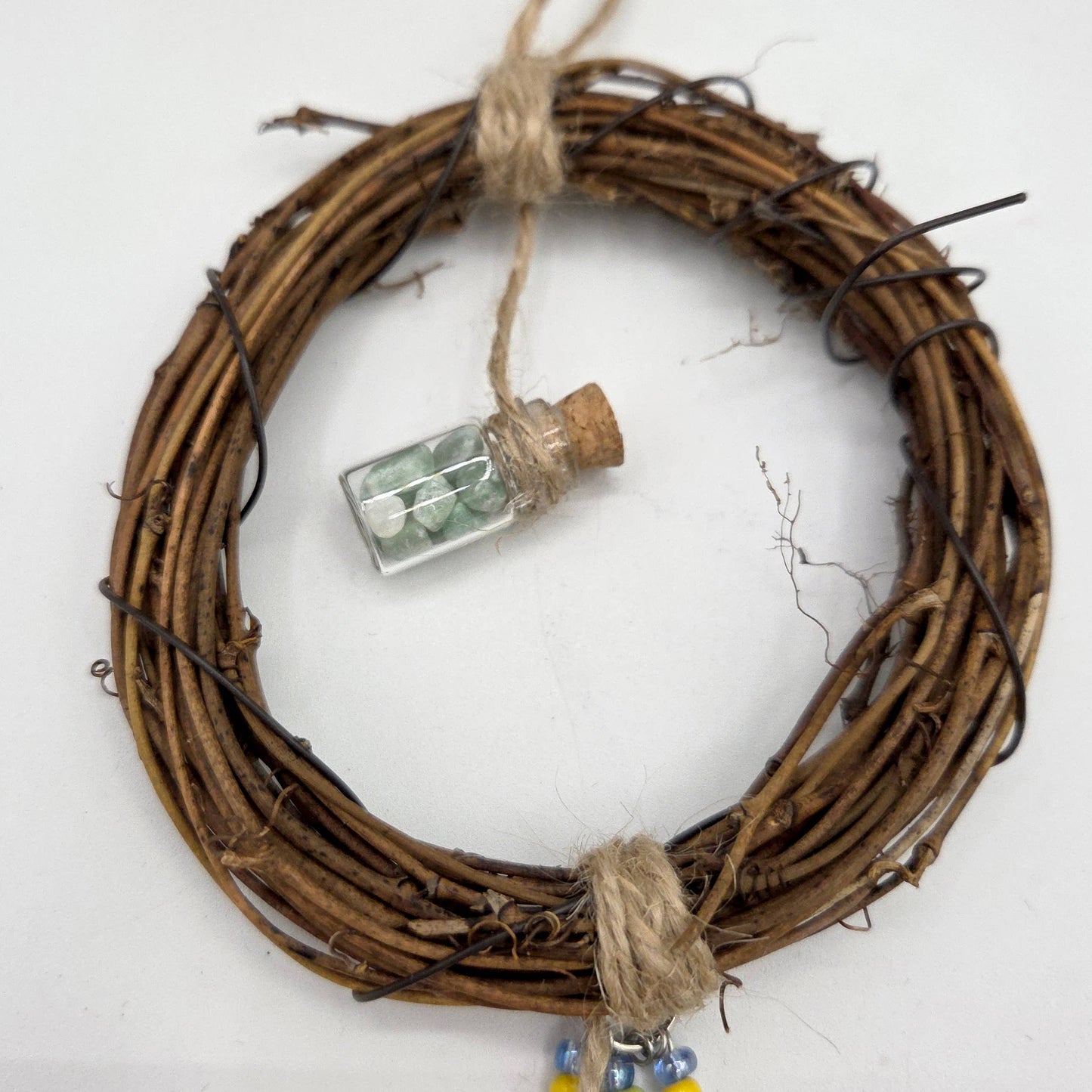 The beads are made of Watermelon Tourmaline, Glass, and plastic. The gemstones in the middle of the wreath are made of Green aventurine.