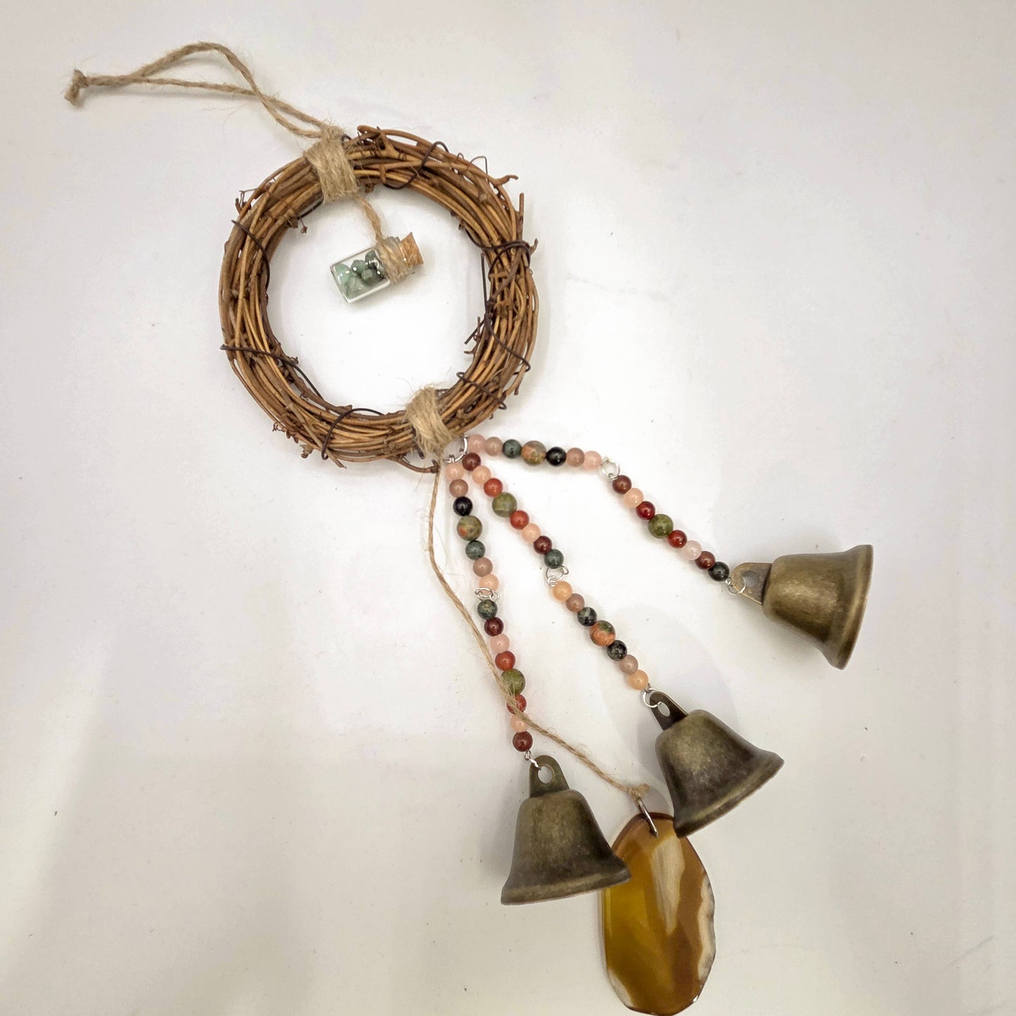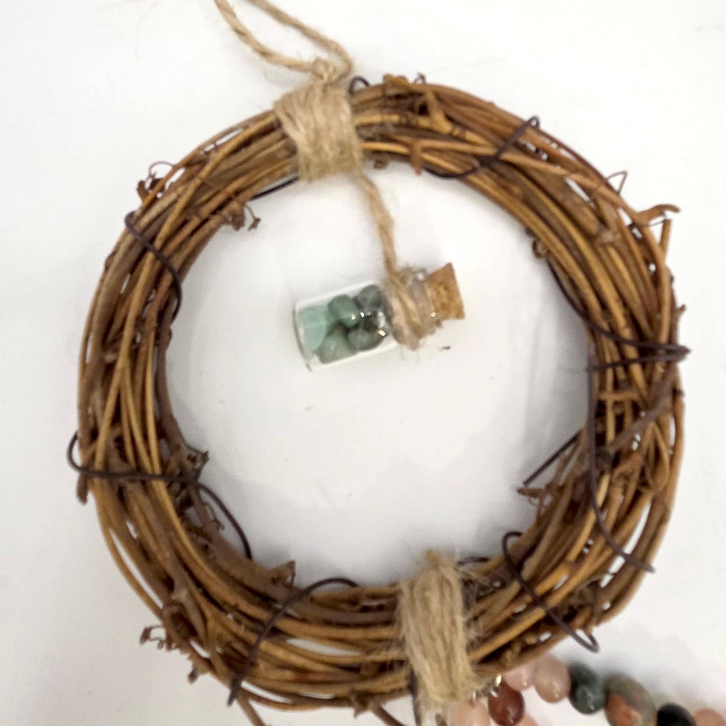 The beads are made of Unakite, Kambaba, Carnelian, and glass. In the middle of the wreath, a glass vial of Emerald chips is placed.