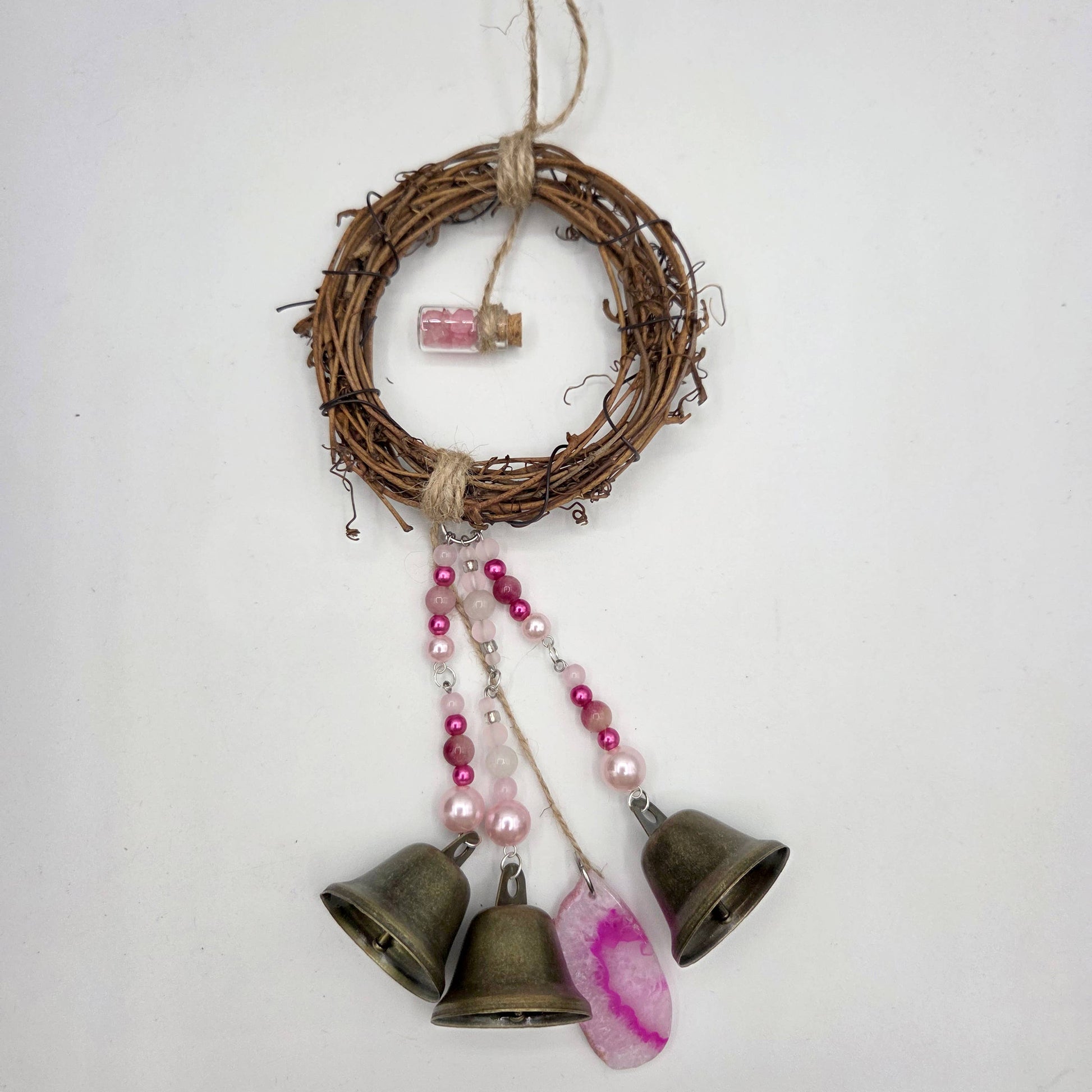 The hanger is made of naturally dyed agate slices that vary in size and color. The beads are made of Quartz, Watermelon Tourmaline, glass, and plastic. The gemstones in the middle of the wreath are made of Dyed Pink quartz.