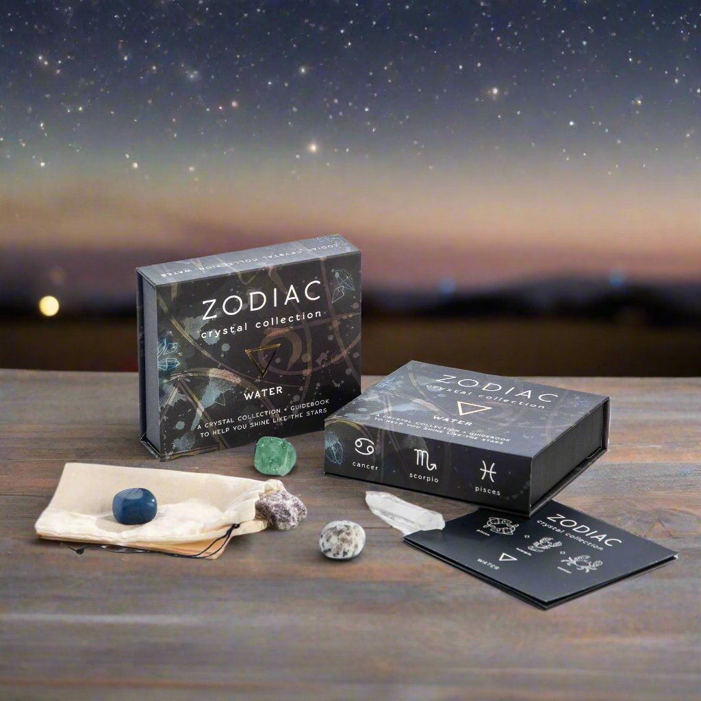 - Zodiac Crystal Collection: Water is a 5-piece crystal set and guidebook for water birth signs (Cancer, Scorpio, and Pisces). - The guidebook illuminates many details of the foundations of astrology and alchemy, including personality aspects of the water element, zodiac constellations, sacred geometry, and alchemical correspondences to astrology with fun, interactive charts. Content Features: crystal properties curated for 1 zodiac element + 3 corresponding birth signs and guidebook introducing topics of astrology and alchemy with user-friendly graphics. Package Features: gold foil accents, cotton muslin bag, lay flat box design, clear PVC cover, and recycling information. Includes: -2″ clear quartz (raw, natural point) -fluorite (polished) -blue aventurine (polished) -lepidolite (raw) -blue aragonite (matte) Size: 4″L x 4.5″W x 1.2″H